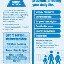 Streetadvice event at Wythenshawe Forum on Tuesday 3rd May, from 10am to 1pm.